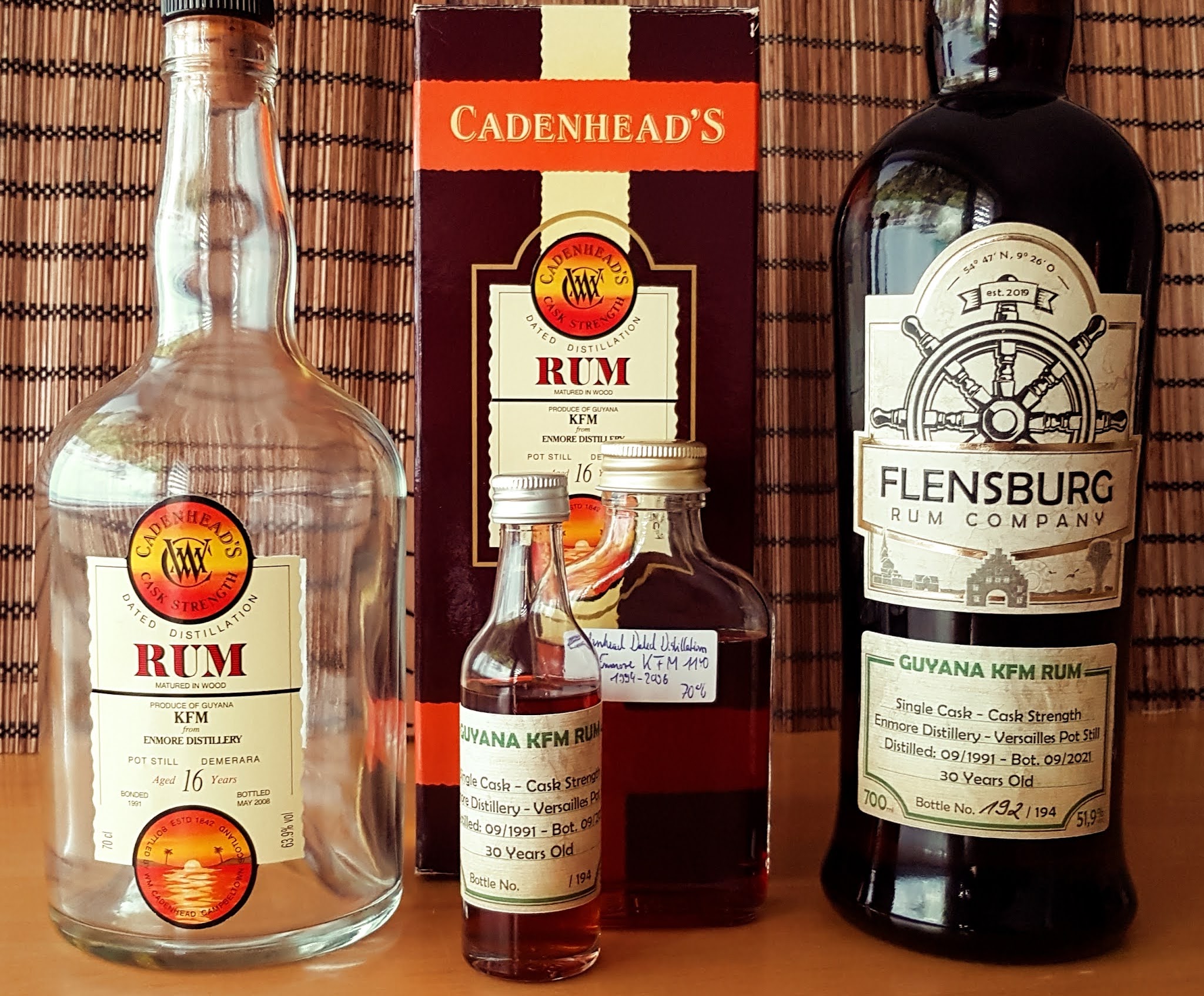 Die erste Abfüllung stammt von Cadenhead und gehört zur Dated Distillation Series. Von dieser besitze ich nur den Cadenhead Dated Distillation Enmore Distillery KFM 1991 16 YO mit 63,9%vol. Es gab noch eine zweite Version, nämlich den jüngeren Dated Distillation Enmore Distillery KFM 1991 12 YO mit 66% vol. Das es 2011 überhaupt noch diesen Rum zu kaufen gab, glänzte an ein Wunder, zeugte aber vom damaligen Desinteresse an der Spirituose Rum. Heute, zehn Jahre später, hat sich dies komplett geändert. Zu meiner Schande muss ich gestehen, dass ich nie ein Review über ihn geschrieben habe. Dies wird hiermit nachgeholt. Es kommt allerdings 9 bis 10 Jahre zu spät. Die zweite Abfüllung ist der Flensburger Rum Company Enmore KFM 1991 30YO mit 51,9%vol. Hierzu wurde mir unaufgefordert ein Sample zugeschickt, worüber ich mich sehr gefreut habe. Was mich weniger gefreut hat ist die Tatsache, dass ich dieses Review verspätet verfasst und nun auch veröffentlicht habe. Auf meiner Arbeit läuft gerade nicht wirklich alles zum Besten und für nächstes Jahr steht ein interner Umzug mit dem verbundenen Chaos und Überstunden an. Ihr könnt euch meine Freude dazu vorstellen. Es wird das ganze nächste Jahr in Anspruch nehmen. Der Zweite Rum hatte ebenfalls einen Vorgänger. Es war der Flensburger Rum Company Enmore KFM 1991 29YO mit lediglich 45,4%vol. Mein ehemaliger Blog-Kollege Flo hat über jene Abfüllung ein Review geschrieben. Mir selbst ist diese jüngere Abfüllung mit mehr Fassreife in meiner Auszeit entgangen.